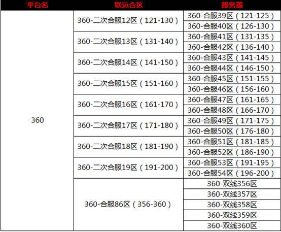 为了让大家有一个更为广阔的战斗和交流的舞台,我们决定于2016年3月31日0:00-10:00期间对以下服务器进行合区维护,维护结束后,以下区服的玩家数据将实现互通,更为激烈的战斗将等待着您和您的团队!