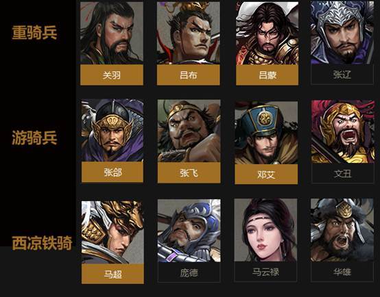 大皇帝的骑兵有3个分类,分别是游骑兵、重骑兵和西凉铁骑。目前已经出现的武将,重骑兵有关羽、吕布、吕蒙和张辽,游骑兵有张郃、张飞、邓艾和文丑,西凉铁骑有马超、庞德、马云禄和华雄。