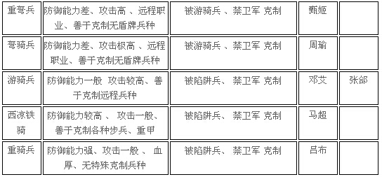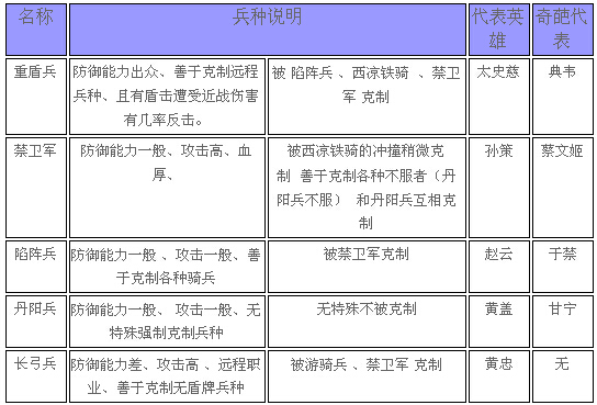 游戏中兵种分为10种,分别为 重盾兵、禁卫军、 长弓兵、重弩兵、弩骑兵 重骑兵、 游骑兵、 西凉铁骑、 陷阵兵 丹阳兵 不同兵种有不同的特点和相克属性,明智的君主会根据对方出兵情况来选择应付的军队。
