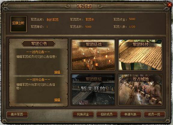 军团长可开启军团征战,每日只能开启一次军团副本,挑战成功后可获得大量军团资金和额外奖励。