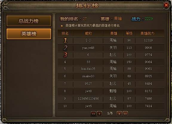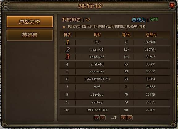 《大皇帝》的排行榜目前分位2类,分别记录总战力以及英雄战力排名前50的玩家。